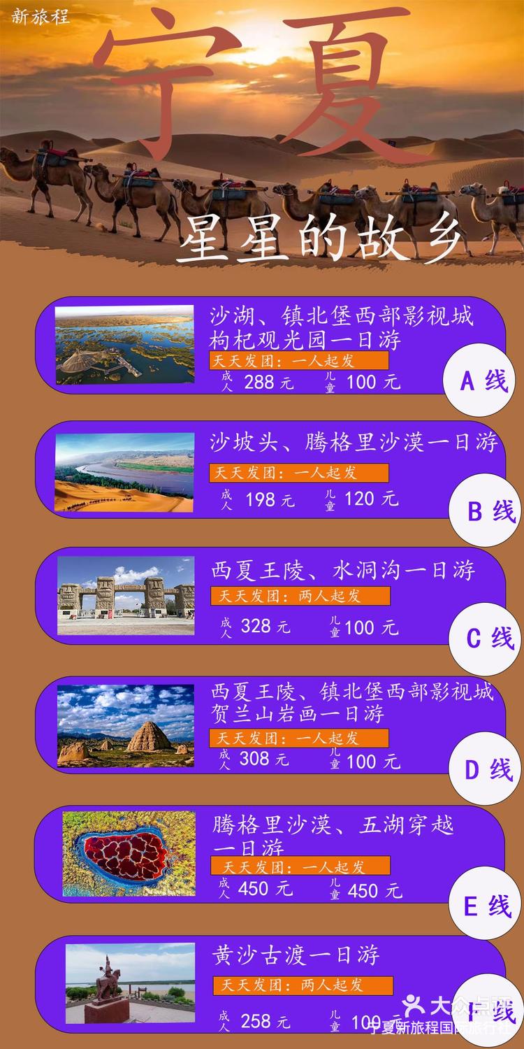 摘要:本文將為你全面解析銀川一日游跟團價格,讓你了解不同旅游線路和服務(wù)的費用構(gòu)成,輕松選擇適合自己的旅游方案。暢游寧夏的美景,感受獨特的地域文化和風(fēng)土人情,讓你的旅行更加愉快和難忘。本文為你提供詳盡的價格信息和旅游建議,幫助你更好地規(guī)劃行程,享受美好的旅行體驗。